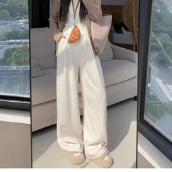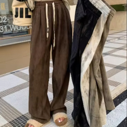 سروال فخم سميك واسع الساق عارضة عالية الخصر إغلاق مرن تنوعا مستقيم تصميم شريط عمودي لفصل الشتاء