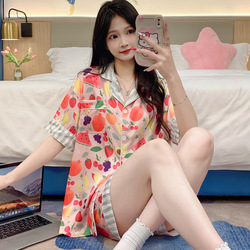 المرأة الصيف عارضة عبر الحدود الحرير الفاكهة الجديدة المطبوعة قصيرة الأكمام السراويل XL من قطعتين الملابس المنزلية